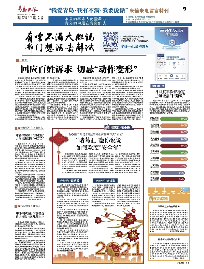 过一个安全祥和的春节,与广大市民的切身利益休戚相关。随着年关逼近,近日市民留言和来信、来电中此类问题依旧热度不减,需持续关注。为此,本报今起推出“诸葛汇·安全策”活动,邀请广大读者、网友前往青岛日报社观海新闻客户端(扫描上方二维码)“直通12345”栏目留言,或发送邮件到邮箱qdrbyljdb@163.com,就生活中遇到的各种安全问题提出意见、建议(留言请在标题前注明“诸葛汇·安全策”,编辑将择选摘登并提报给相关部门)。