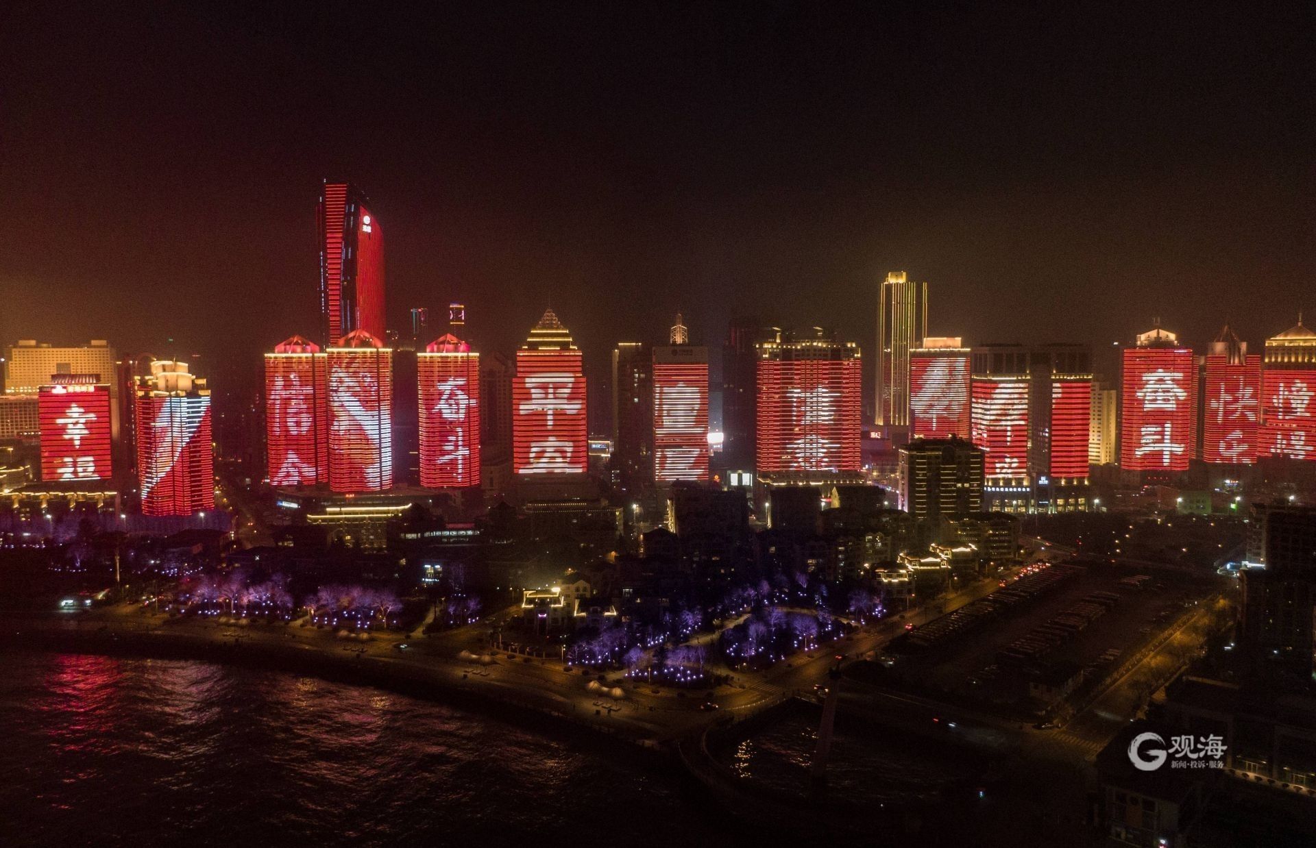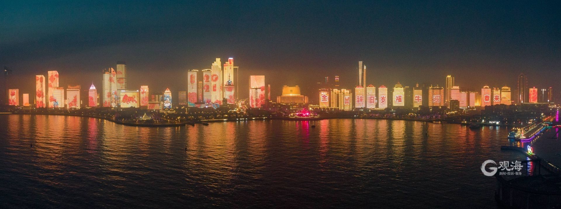 观海新闻记者在现场看到,“金鼠辞旧岁 福牛迎春来”“新年快乐 国泰民安”等新年祝福语,以及福牛、礼花等新年元素依次亮相沿海高楼,营造出欢乐祥和的新年氛围。