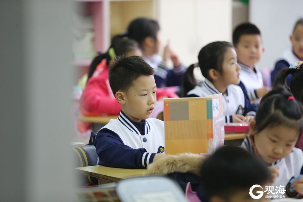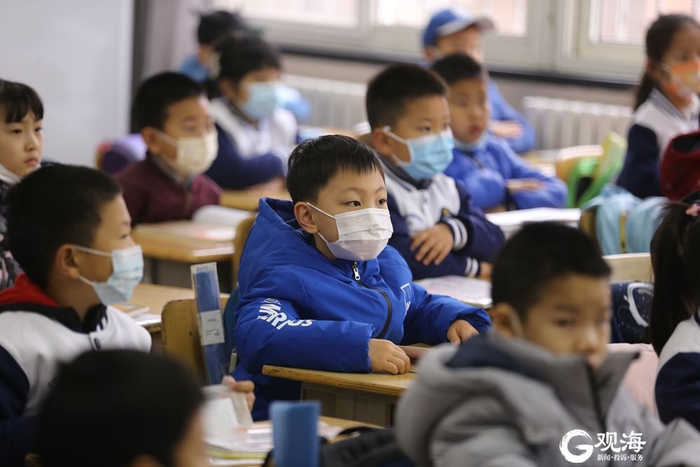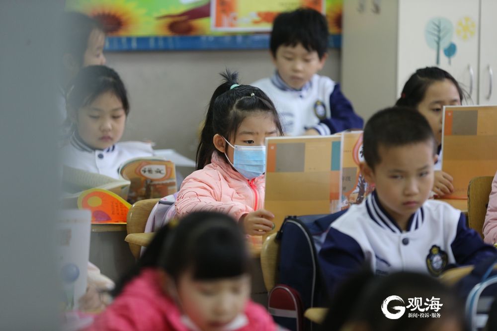 早上八点,青岛莱芜一路小学的同学们带着鲜艳的红领巾,穿着校服,已整整齐齐地坐在了教室中。记者 王世锋 摄