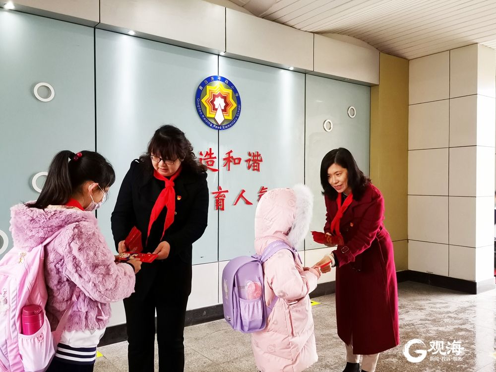 新学期第一天,青岛开平路小学以创意红包的方式,开启了学校“百年党史伴我成长,红色光辉照亮未来”为主题的开学典礼。一早,初春燕校长、韩娟副校长和党员教师代表戴着鲜艳的红领巾,手拿大红包,站在校门处,迎接每一位同学的到来。记者 王世锋 摄