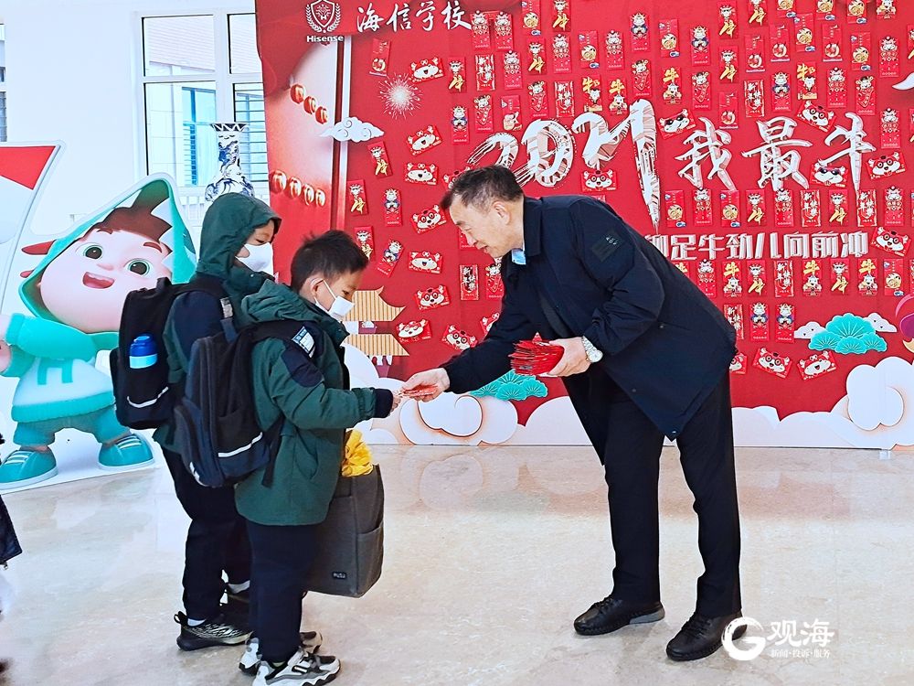 开学当天,青岛海信学校的学生们就被教学楼上的一面“红包”祝福墙吸引。孩子们惊讶地接过“红包”,原来早前一天学生返校时,就写下了对新学期的美好期待与祝福。学校老师连夜将这些写有祝福的纸张放入红包,制作成了“红包”墙。记者 王世锋 摄