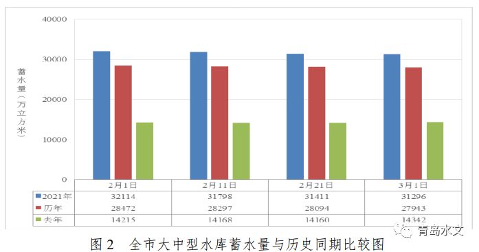 2月末全市23座大中型水库(不含棘洪滩)蓄水31296万立方米,比历年同期多蓄3353万立方米,比去年同期多蓄16954万立方米,较月初少蓄818万立方米。2月末莱西大中型水库蓄水量较历年同期偏少49.6%,西海岸、胶州、城阳、即墨、平度分别偏多88.4%、74.2%、66.2%、52.9%和3.5%。