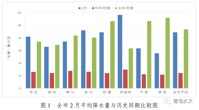 截至2月末,全市今年累计降水量47.9毫米,比历年同期偏多26.9毫米(128.1%),比去年同期偏少29.7毫米(38.3%),在1952~2021年共70年水文统计资料系列中,从大到小排第7位,降水偏多。与历年同期相比,各区(市)均偏多,西海岸、即墨、胶州偏多1倍以上,市区、平度、城阳、崂山、莱西偏多6成以上。