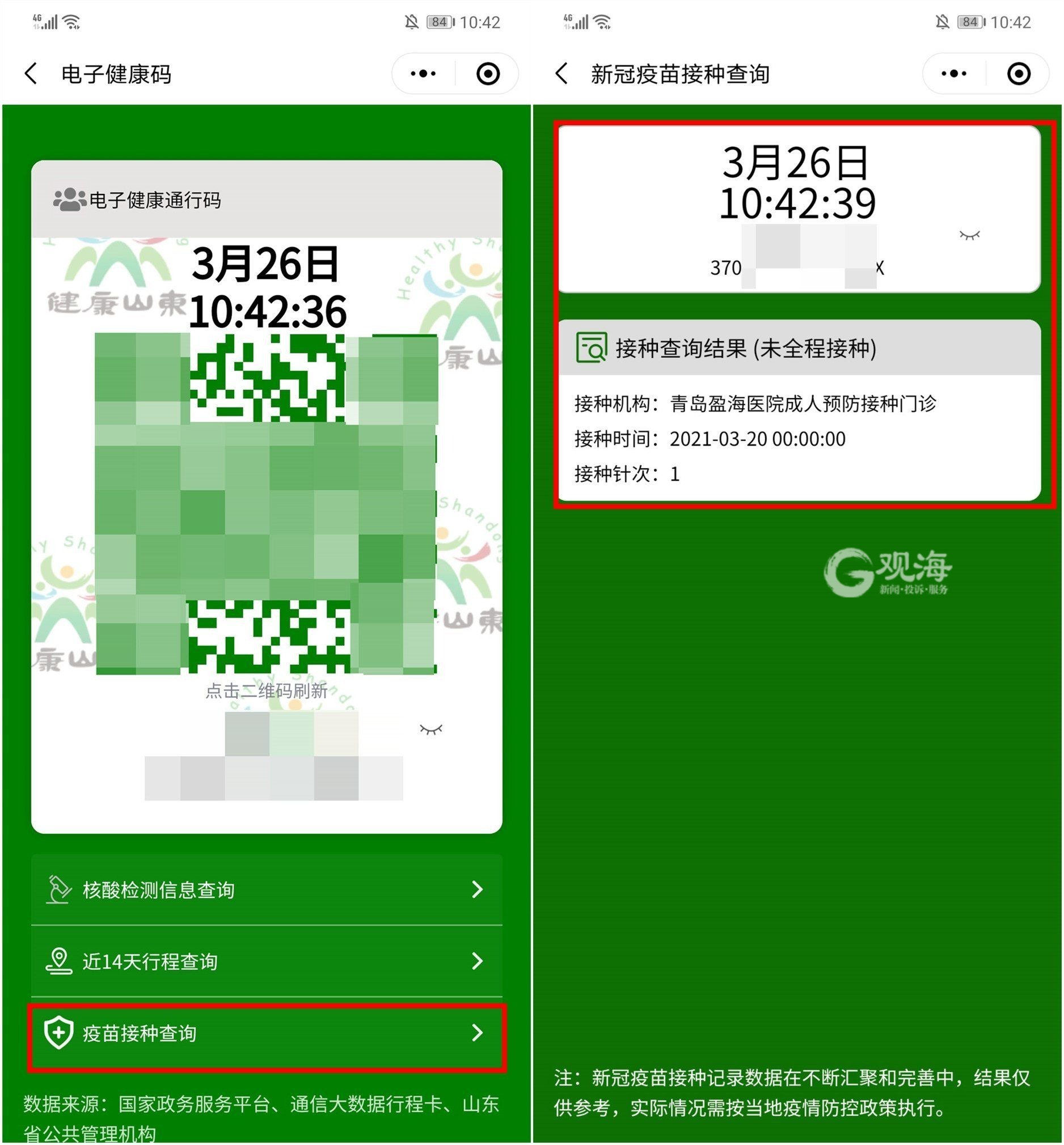 市民们是否发现山东省电子健康通行码的新变化?除核酸检测信息查询、近14天行程查询外,增加了一项功能:疫苗接种查询。