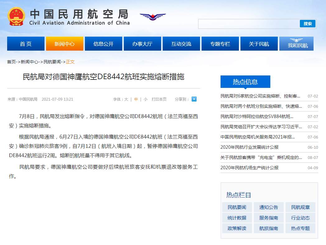 7月8日,民航局发出熔断指令,对德国神鹰航空公司DE8442航班(法兰克福至西安)实施熔断措施。