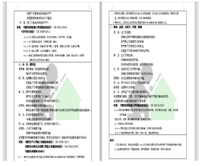 1.层高(每个生活功能区域的五点层高)2.净使用面积(房屋的空间使用面积)3.垂直度(墙体是否垂直)4.平整度(墙体地面是否平整)5.阴阳角(室内阴角阳角收口是否在90度)6.门窗工程(门窗安装方正、密封、使用功能等检测)7.水、电、地暖工程(渗漏、防水、通水、电路安全、暖气压力)8.墙体地面建筑结构和精装修的木作、五金安装及其湿作业工程等质量和感官查验! 依据国家规范标准,数百个验点的查验,最大限度的保证您房屋居住 使用上的美观和消除使用上的安全的隐患。