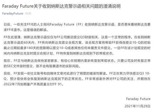 但FF不得不对指控进行调查,错过了发布财报的时间,并因此收到了纳斯达克的警示函。对此,FF在说明中表示,收到警告函并不意味着纳斯达克要求FF退市,这是错误的解读,并表示一旦FF在该计划规定的时间内向纳斯达克及时提交合规计划,FF将恢复到纳斯达克规则下的常规状态。