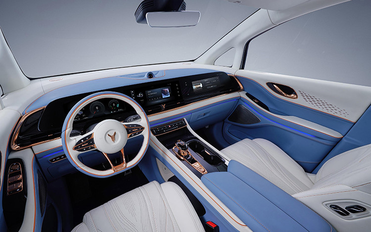 内饰部分,新车的风格也是极尽豪华。整体风格与岚图现款车型保持一致,采用了游艇风格的设计,特别是金色的点缀,极大地提升了车辆的豪华感。新车采用了三连屏的设计,提升车辆的科技感,而在副驾位的屏幕,进一步提升了乘客的乘坐体验。