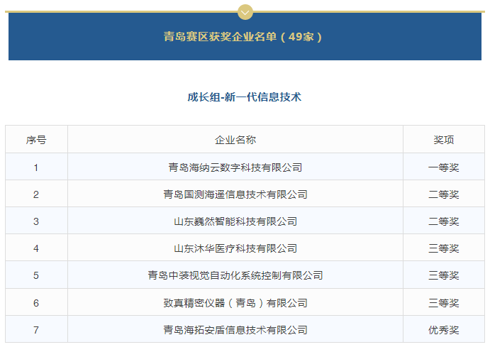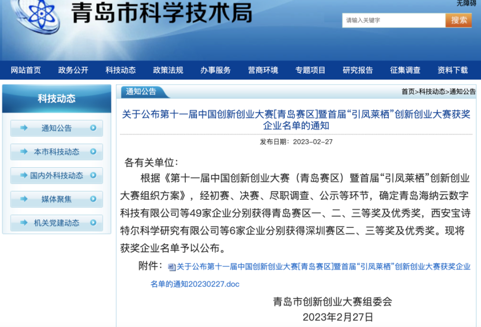 2月27日,青岛市科技局公布了第十一届中国创新创业大赛【青岛赛区】获奖企业名单。青岛海纳云数字科技有限公司等49家企业分别获得青岛赛区一、二、三等奖及优秀奖,西安宝诗特尔科学研究有限公司等6家企业分别获得深圳赛区二、三等奖及优秀奖。