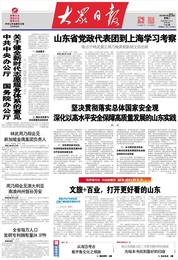 作为农业大省,山东在保障粮食安全上奋发有为。严守耕地保护红线,率先实行县乡村三级“田长制”,大力开发各类非传统耕地资源,积极探索盐碱地综合利用等新模式。2023年全省粮食播种面积12581.9万亩,累计建成高标准农田7643.7万亩,耕地面积净增加128万亩。强化种业振兴支撑,主要粮食作物良种实现全覆盖,小麦品种“济麦22”累计推广面积3.5亿亩,连续11年稳居全国小麦种植面积首位。加大农业科技赋能,持续推进农业关键技术攻关,2023年全省农业科技进步贡献率达到66.8%。