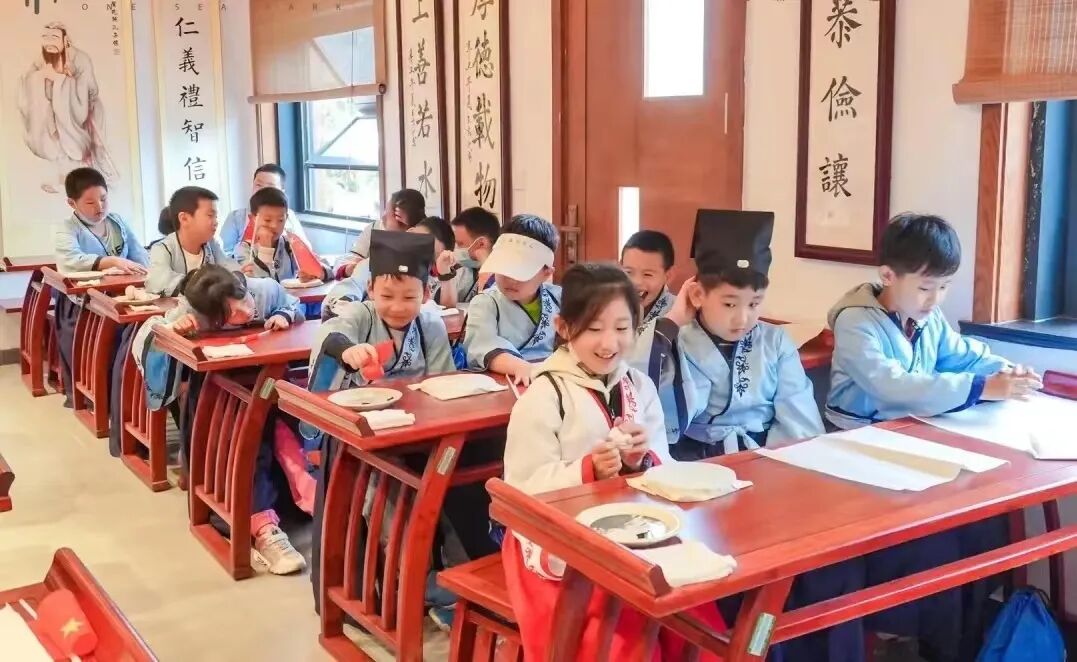 孩子们在青岛琅琊台景区的“琅琊学堂”学习古法“拓片”传统技艺