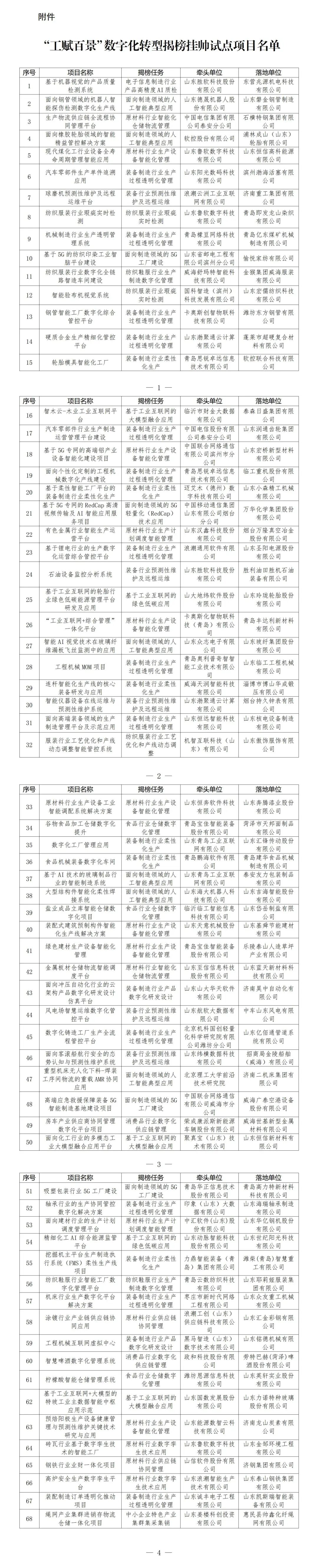 根据《山东省制造业数字化转型提标行动方案(2023-2025年)》《山东省工业互联网赋能制造业数字化转型资金管理办法及实施细则(试行)》等文件要求,省工业和信息化厅组织开展了“工赋百景”数字化转型揭榜挂帅试点项目申报工作,经地市推荐、符合性审查、材料评审、实地核查等程序,拟择优确定68个项目作为试点项目,现予以公示,公示期为2024年4月26日至4月30日。公示期间如有异议,请以书面形式向省工业和信息化厅反馈,个人反映请提供真实姓名及联系方式,单位反映请加盖公章。