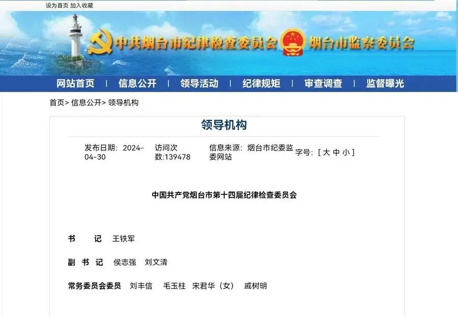 据烟台市纪委监委网站“领导机构”栏目显示,王铁军已任中国共产党烟台市第十四届纪律检查委员会书记。