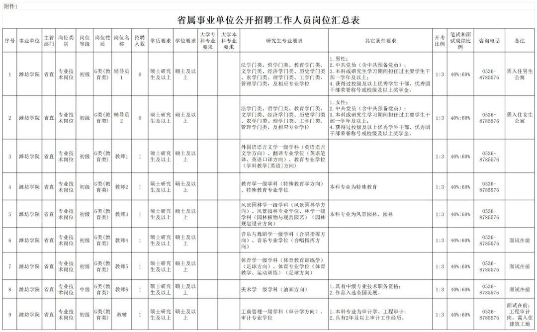 1.详见《山东交通职业学院公开招聘工作人员岗位汇总表》(附件1)。
