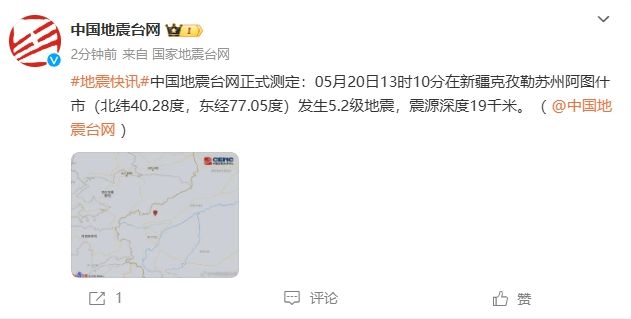 中国地震台网正式测定:5月20日13时10分在新疆克孜勒苏州阿图什市(北纬40.28度,东经77.05度)发生5.2级地震,震源深度19千米。