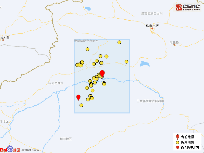 历史地震:根据中国地震台网速报目录,震中周边200公里内近5年来发生3级以上地震共344次,最大地震是2023年1月30日在新疆阿克苏地区沙雅县发生的6.1级地震(距离本次震中202公里),按震级大小前50次历史地震分布如图。