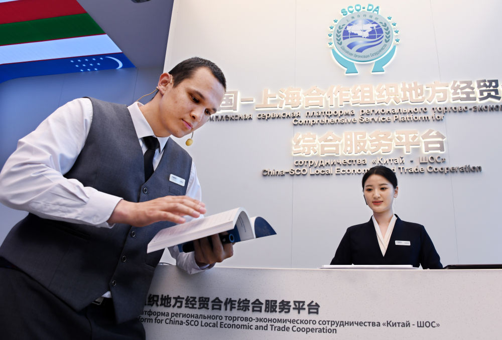 2023年5月,中国—上海合作组织地方经贸合作综合服务平台讲解员赛义德·赛达赫梅多夫为接待来访做准备。