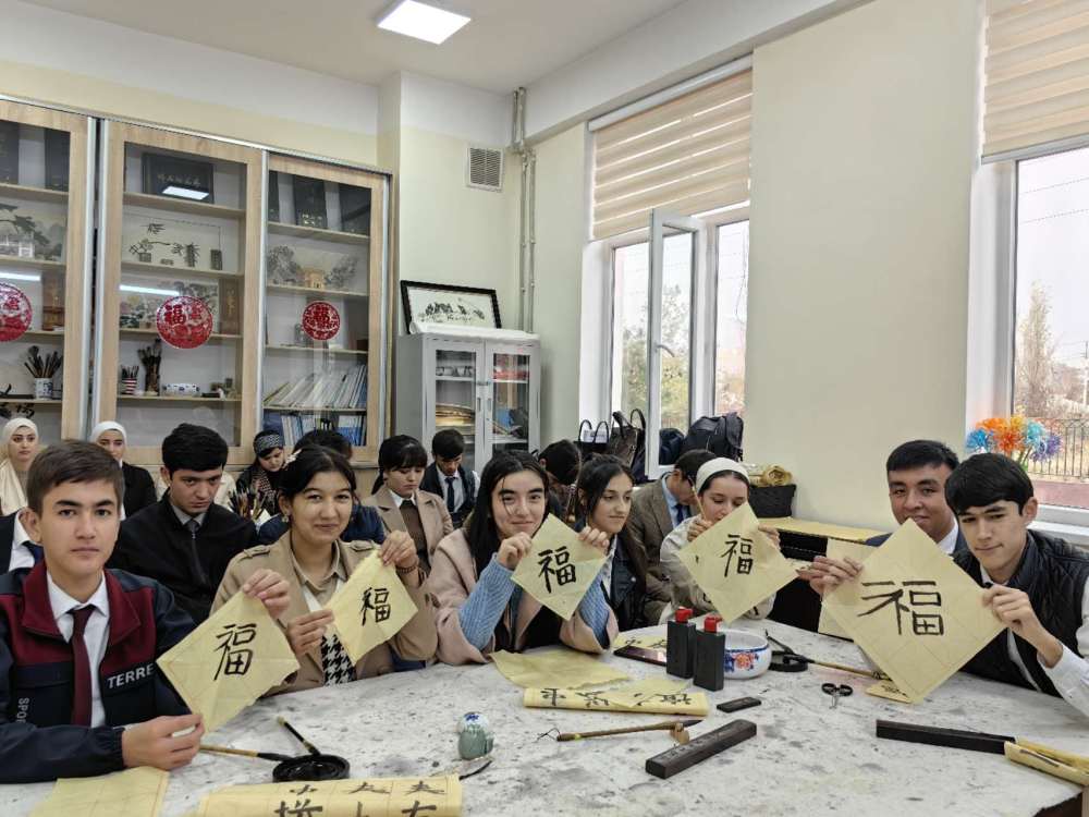 在塔吉克斯坦首都杜尚别,学生在塔吉克斯坦民族大学孔子学院学习中国书法。