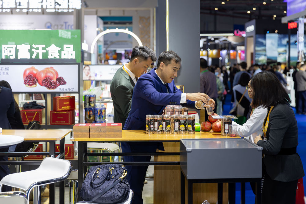 2023年11月,在第六届进博会食品及农产品展区现场,参展人员准备试吃阿富汗松子。