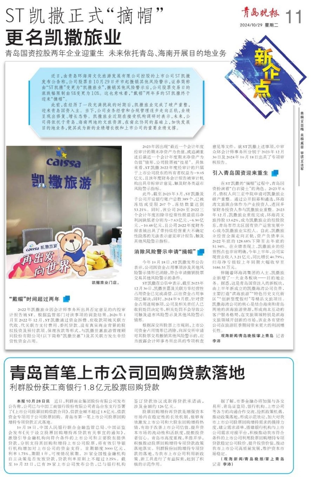 近日,由青岛环海湾文化旅游发展有限公司控股的上市公司ST凯撒发布公告称,公司股票自10月29日开市起撤销其他风险警示,证券简称由“ST凯撒”变更为“凯撒旅业”,撤销其他风险警示后,公司股票交易日的涨跌幅限制由5%变更为10%。这也意味着,“戴帽”两年多的ST凯撒终于迎来“摘帽”。