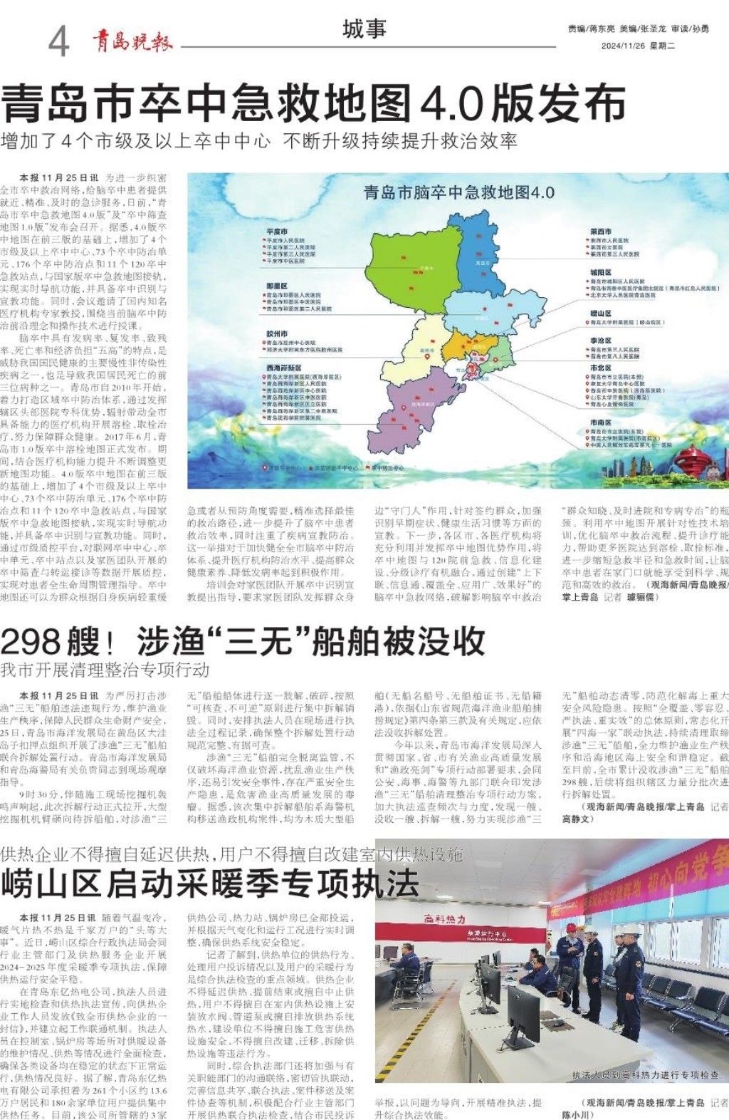 本报11月25日讯 为进一步织密全市卒中救治网络,给脑卒中患者提供就近、精准、及时的急诊服务,日前,“青岛市卒中急救地图4.0版”及“卒中筛查地图1.0版”发布会召开。据悉,4.0版卒中地图在前三版的基础上,增加了4个市级及以上卒中中心、73个卒中防治单元、176个卒中防治点和11个120卒中急救站点,与国家版卒中急救地图接轨,实现实时导航功能,并具备卒中识别与宣教功能。同时,会议邀请了国内知名医疗机构专家教授,围绕当前脑卒中防治前沿理念和操作技术进行授课。