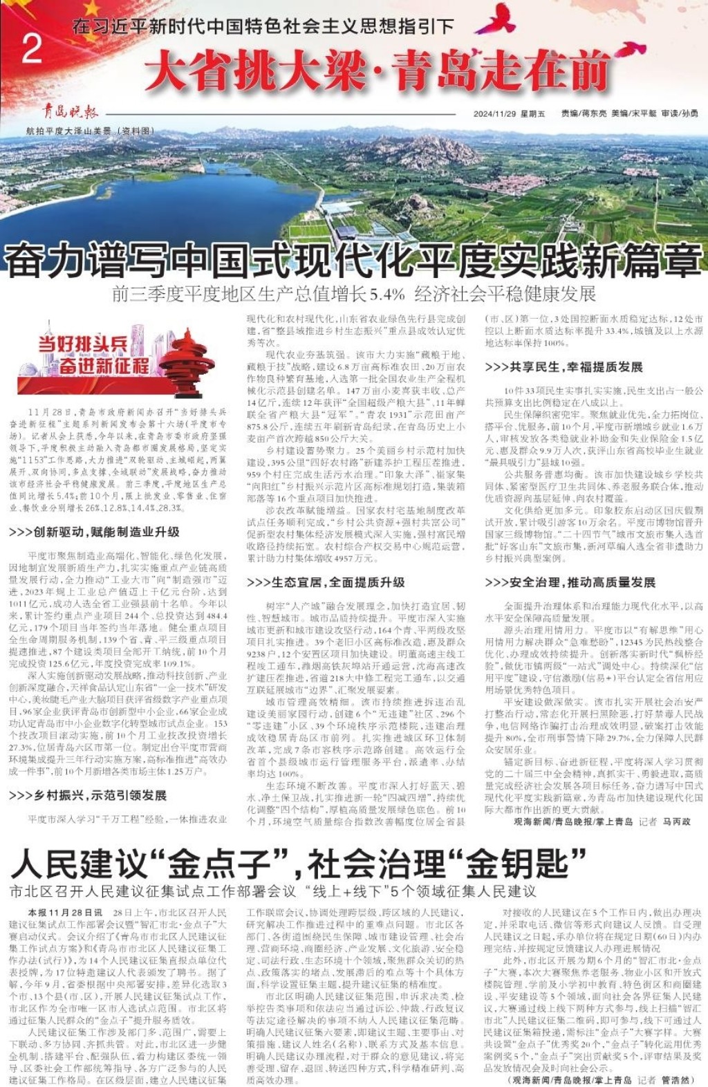 锚定新目标、奋进新征程,平度将深入学习贯彻党的二十届三中全会精神,真抓实干、勇毅进取,高质量完成经济社会发展各项目标任务,奋力谱写中国式现代化平度实践新篇章,为青岛市加快建设现代化国际大都市作出新的更大贡献。