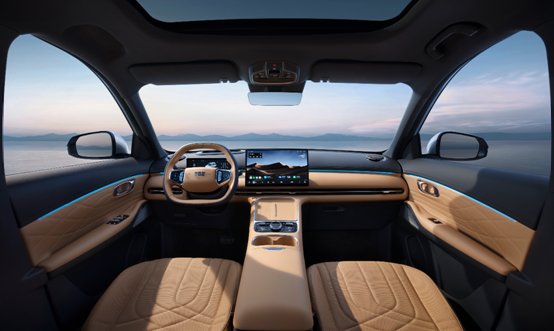 在内饰座舱上,悬浮式音响和“中国太师椅”的座椅设计,营造出极为舒适的驾乘氛围。同时,得益于GEA架构在空间里利用上的优势,吉利银河星舰7 EM-i空间宽敞,布局合理,后排乘客能享受到同级最大的头部、肩部和膝部空间。