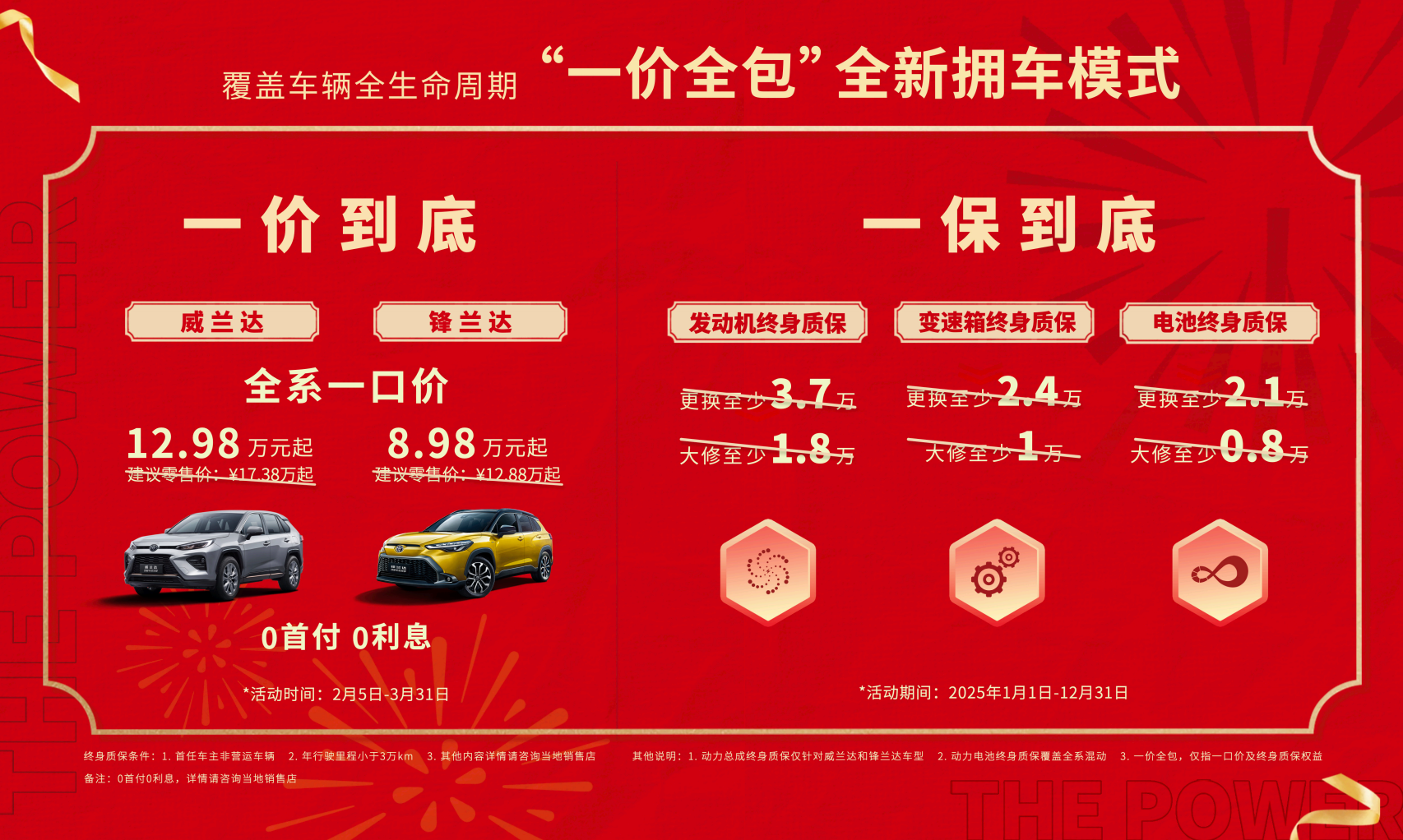 区别于其他厂家的“一口价”,广汽丰田不仅把价格打下去,还把权益提上来,为威兰达和锋兰达两款车型的发动机、变速箱和双擎版本的混动电池提供厂家终身质保,在“一价到底”之外,为消费者“一保到底”。