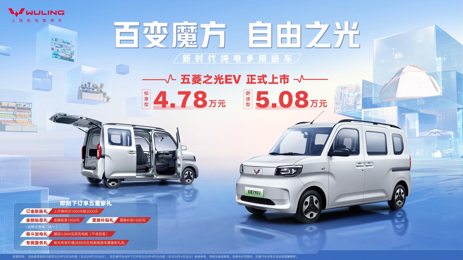 “自由之光,为爱而拼”。2月14日,情人节之际,五菱之光EV为热爱而来,于广州万达广场正式官宣上市!新车共推出标准型和舒适型两个版本,官方指导价4.78万元-5.08万元。作为新时代纯电多用途新标杆,五菱之光EV全车预留20处可拓展区域,以超强拓展性延展奋斗致富无限可能;创新搭载对外放电及座椅纯平放倒功能,满足新时代奋斗者的拓展自由、空间自由、装载自由、出行自由,生动演绎新时代自由之光。