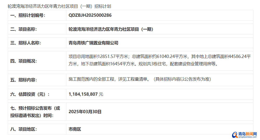据招标网公示,该项目一二期拟实施,由青岛青铁广瑞置业有限公司建设。一期项目估算投资高达118415.8807万元,占地12851.57平方米,总建筑面积约61040.24平方米。其中,地上面积44586.24平方米,地下面积16454平方米,规划建设3栋住宅,还会配套建设物业管理用房。