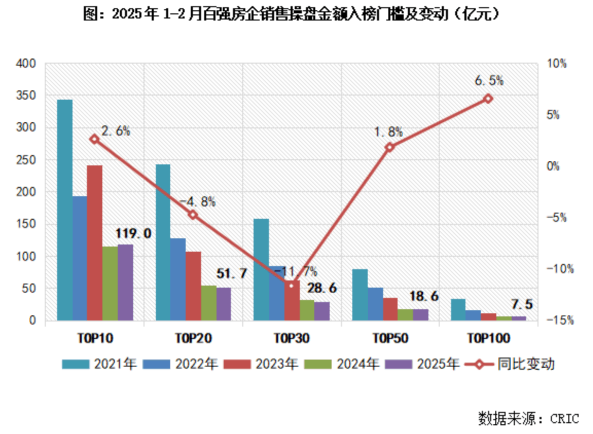 2月,百强房企各梯队销售门槛变动分化。其中,TOP20和TOP30房企销售操盘金额门槛分别同比降低4.8%和11.7%至51.7亿元和28.6亿元。TOP50和TOP100房企门槛分别同比提升1.8%和6.5%至18.6亿元和7.5亿元。
