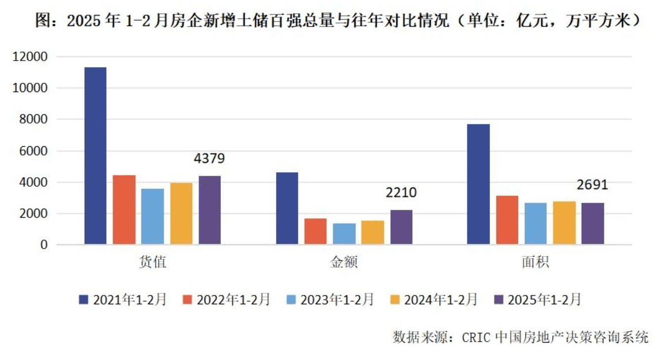报告显示,2025年1-2月份,新增土储百强房企的新增货值、总价和建面百强之和分别为4379亿元,2210亿元和2691万平方米,货值同比增加11.3%,金额同比增长43.5%,建面同比小幅回落2.2%。