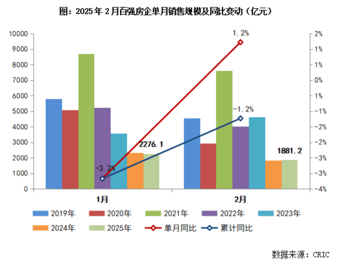 克而瑞研究中心发布的报告显示,2月份TOP100房企实现销售操盘金额1881.2亿元,同比增长1.2%。