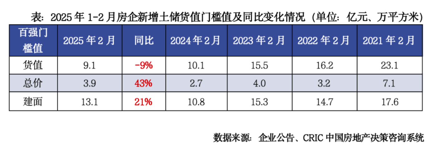 截止2月末,新增土储货值百强门槛值为9.1亿元,同比下降9%,但降幅比1月末收窄23个百分点;新增总价百强门槛值为3.9亿元,同比提升43%,新增建面百强门槛值为13.1万平方米,同比微增21%。