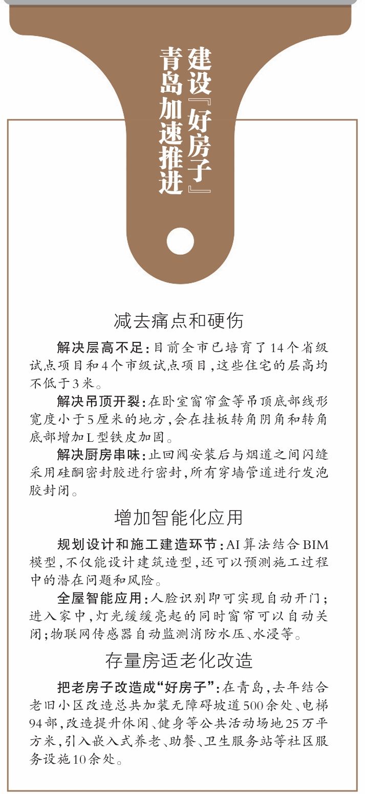如今,“好房子”的画像越来越清晰的同时,各大城市纷纷从标准、政策、示范、监管、产业等方面,开展“好房子”建设探索实践。近年来,山东把高品质住宅的开发建设作为切入点,引导和鼓励开发企业建群众心目中的“好房子”。青岛也出台“好房子”建设技术导则,成立“好房子”产业联盟,搭建产业云平台,推动全产业链条协作,加强多元化高品质住宅产品供给,不断增强市场竞争力和可持续发展能力。