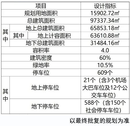 根据规划方案显示,项目规划用地约1.59公顷,规划总建筑面积约9.82万平方米,其中地上建筑面积约6.59万平方米,计容面积约6.36万平方米,地下建筑面积约3.23万平方米。规划两个楼座(其中一栋为21层,另一栋为19层)及其裙房,容积率4.0,建筑密度60%,绿地率10.5%,停车位609个,地上21个,地下588个。