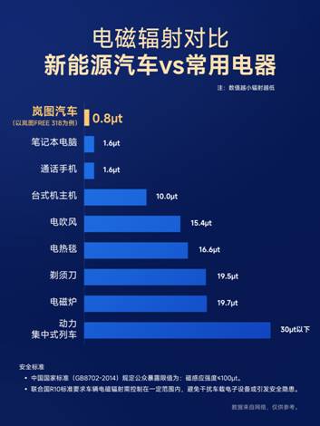 据悉,针对电磁辐射安全领域,岚图汽车采用高压屏蔽线,金属屏蔽层等结构从源头减少电器件产生的电磁辐射,通过专业的线束布置和有效可靠的接地设计,切断电磁辐射的传播路径,保证电器件不因电磁辐射影响产生功能异常。同时,岚图全系车型均按照GB 8702和GB 37130对低频电磁场进行测试,最终数值比国标电磁射限值的1/10还要低。正常用车过程中,甚至远低于手机、笔记本电脑、电吹风等常见家用电器。