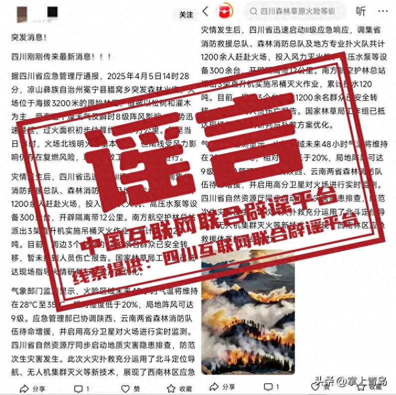真相:4月6日,有网民发布文章称“2025年4月5日14时28分,凉山彝族自治州冕宁县腊窝乡突发森林火灾,火势迅速蔓延,过火面积初步估算约2.3平方公里……”经核实,2025年4月5日,凉山彝族自治州冕宁县腊窝乡并未发生森林火灾,四川省并未启动应急响应,也没有出动应急救援队伍,此消息为谣言。(来源:@四川应急)