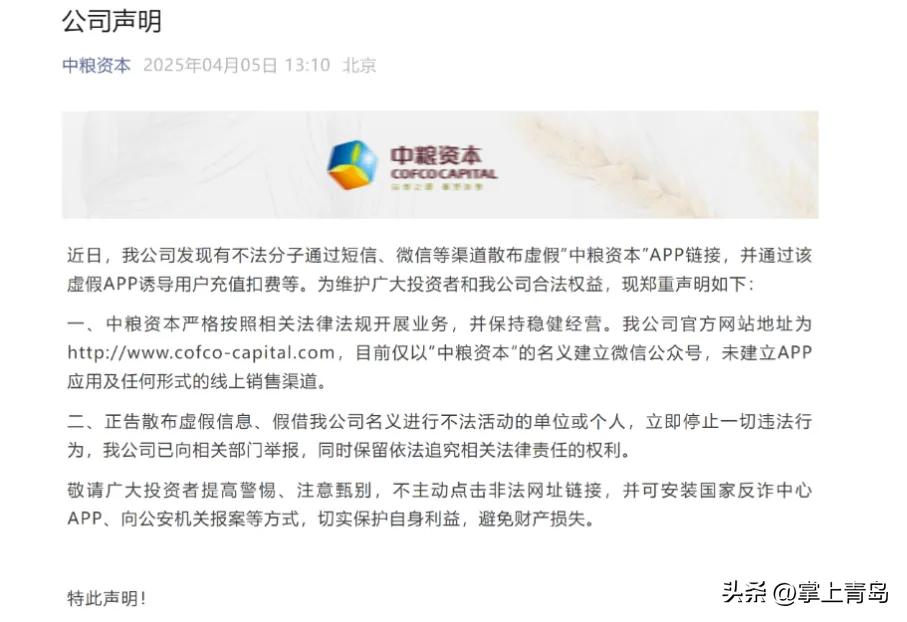 中粮资本正告散布虚假信息、假借公司名义进行不法活动的单位或个人,立即停止一切违法行为,公司已向相关部门举报,同时保留依法追究相关法律责任的权利。(来源:“上海证券报”微信公众号)