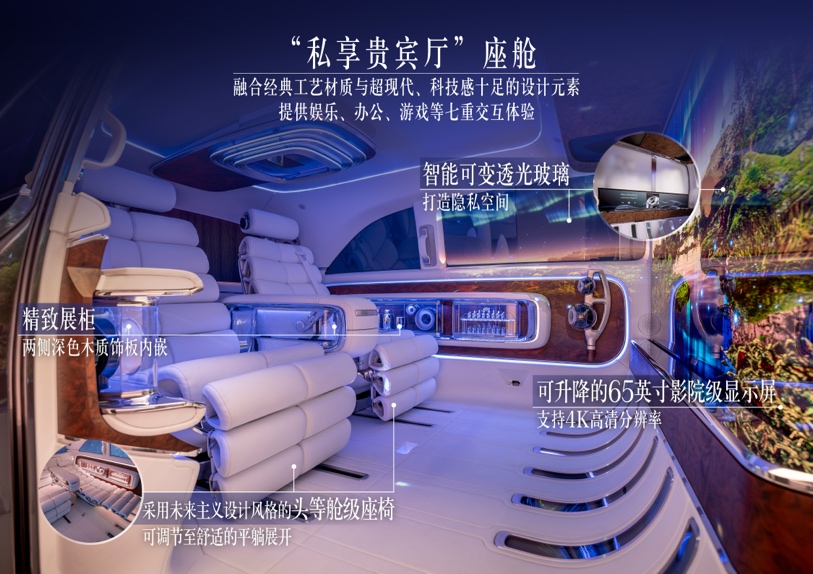 Vision V概念车开启个性化数字豪华的全新维度。带分屏功能的65英寸影院级显示屏可自如升降,以4K超清画质呈现震撼视觉效果。7台投影仪集成于车顶及地板,侧窗更化身为辅助“屏幕”,构建360度全景体验。带杜比全景声的环绕立体声音响系统配备42个扬声器,包含座椅内的振荡器。如茧房般全方位环绕感官的数字体验,为乘客构建七重交互体验世界——娱乐、放松、游戏、办公、购物、探索及卡拉OK,让座舱可化身为“移动影院”、“移动电竞舱”、“移动音乐厅”、“移动办公室”或放松身心的“移动绿洲”。