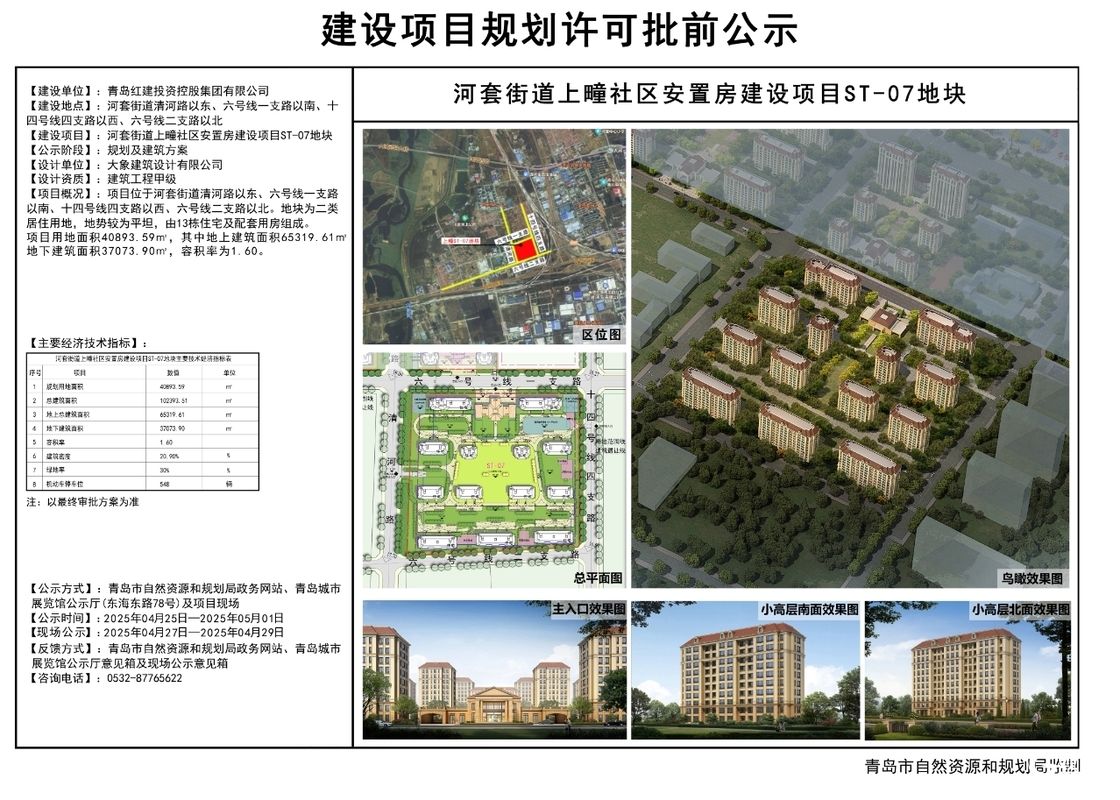 河套街道上疃社区安置房建设项目ST-07地块位于河套街道清河路以东、六号线一支路以南、十四号线四支路以西、六号线二支路以北。地块为二类居住用地,地势较为平坦,由13栋住宅及配套用房组成。项目用地面积40893.59平方米,其中地上建筑面积65319.61平方米,地下建筑面积37073.90平方米,容积率为1.60。(青岛日报/观海新闻记者王冰洁)