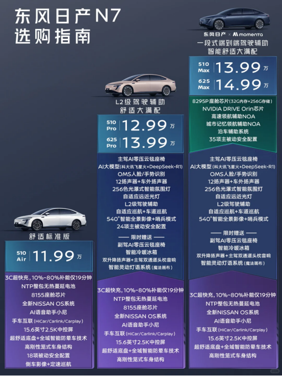 N7作为日产迈向新能源领域的关键车型,给出了令人惊喜的价格——11.99-14.99万元的价格,超出了大部分人的预期。这款合资中大型纯电轿车的性价比和价值感拉满,让不少消费者直呼“真香”。本次N7一共带来5款车型