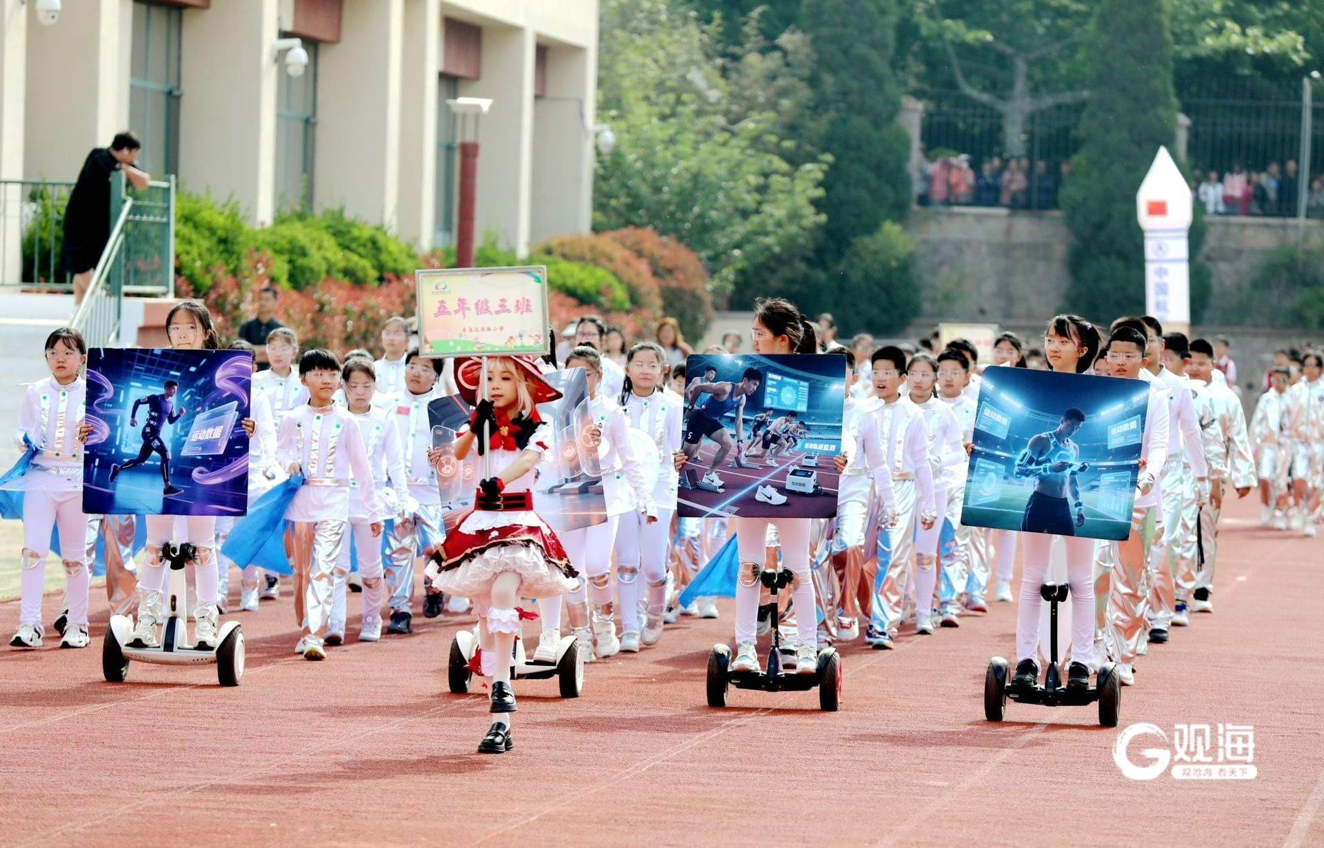 据了解,青岛辽源路小学以培养具有健康身心、家国情怀、善学乐群、发展潜质的新时代小公民为育人目标,将国际化、科技梦、运动与健康融入到运动会入场式中。六年级级部队员们化身国际体育“代言人”:中国皮划艇的坚韧、挥动法网球拍的优雅、跃动巴西排球的热情、NBA篮球的炫酷风采,用行动体现着国际化体育精神;五年级科技主题方队,队员们以科技赋能体育:机器人、北斗导航、航天逐梦……创新主题方阵用智慧与活力诠释“科技助力健康,创新驱动未来”。
