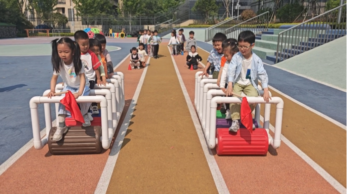 “旱地龙舟赛”:小朋友们化身 “龙舟健将”,齐心协力地划动 “船桨”,旁边传来阵阵加油呐喊声,充满欢乐与激情。小朋友通过旱地龙舟接力赛的方式感受端午节赛龙舟的习俗。