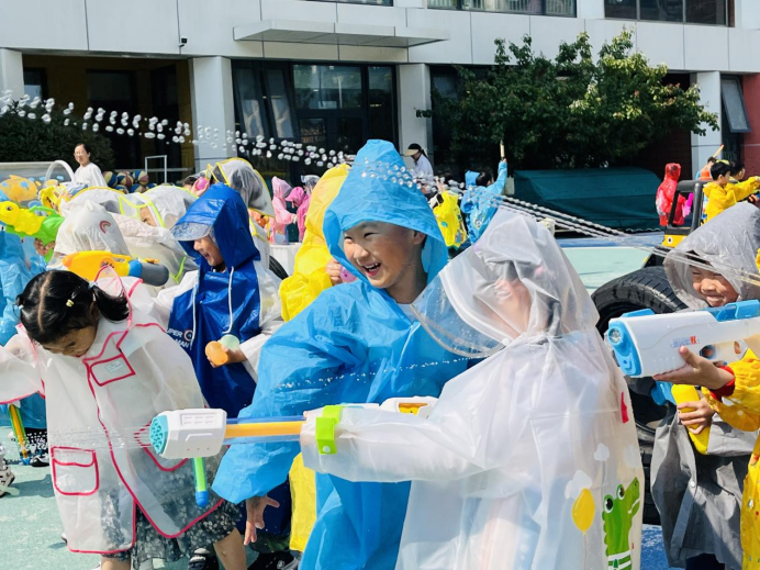 “水枪大战”:绚烂多姿的雨衣,酷炫帅气的水枪,孩子们个个全副武装,兴奋地拿着自己的“作战武器”,雄赳赳、气昂昂地蓄势待发,开启了夏日的清凉。