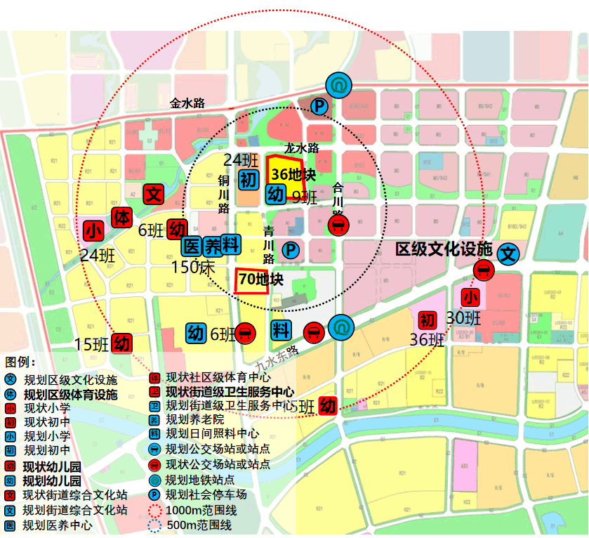 1.道路交通(地铁):现状周边铜川路、九水东路、合川路、龙水路为已建成道路。2.教育与医疗:现状周边有1处初中,2处小学,3处幼儿园;规划周边有1处初中,2处幼儿园,1处医养中心(包括1处养老院及1处二类日间照料中心),1处三类日间照料中心。3.文体设施:规划周边有区级文化设施;现状周边有街道综合文化站、社区级体育中心。4.商业设施:现状周边有丽达购物中心。5.城市公园绿地:现状周边有青龙山公园、李沧区健康主题公园、金水桥公园。