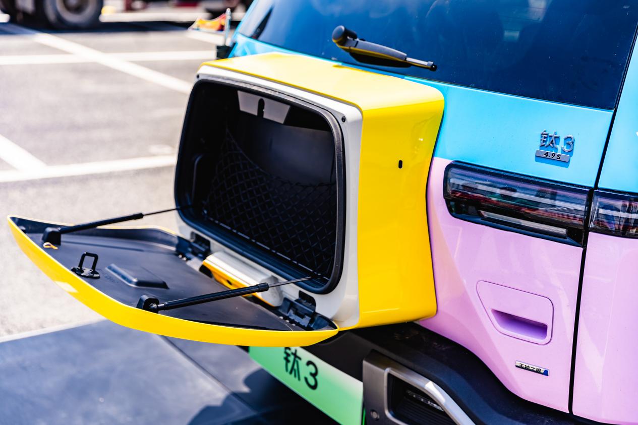 钛3以“星际战车”为设计灵感,将机甲风与未来感完美融合。棱角分明的车身线条,搭配平行排列日间行车灯带、隐藏式门把手与侧开尾门外挂储物盒,酷似机甲战车。雪域白、夜影黑等多色选择,契合个性需求;内饰中,灰色 C 型饰条环绕中控台,搭配多色氛围灯,悬浮式仪表与中控屏科技感十足,座椅舒适配置丰富,兼顾颜值与实用。