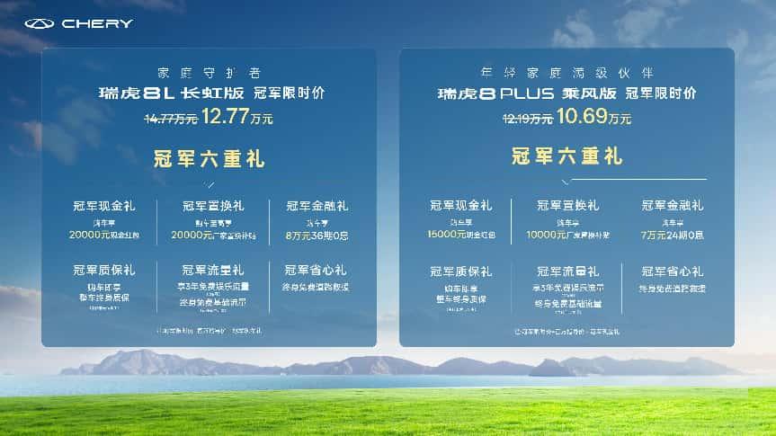 新车正式上市后,瑞虎8L长虹版与瑞虎8 PLUS乘风版将延续瑞虎8冠军家族扎实的产品实力,为用户带来同级中配置更丰富、驾乘体验更出色、品质更可靠的用车感受。即刻购车还可尊享多重礼遇,轻松开启家庭出行的全新旅程。未来,瑞虎8冠军家族将持续以“技术奇瑞”的研发底蕴为基础,紧扣家庭用户对出行场景的升级需求,以用户需求为导向持续深化创新,通过构建更具前瞻性的产品矩阵,持续领跑自主中型SUV市场,为全球家庭用户开启“始终超期待,始终有惊喜”的出行新篇章,让冠军基因在时代更迭中持续焕发生命力。