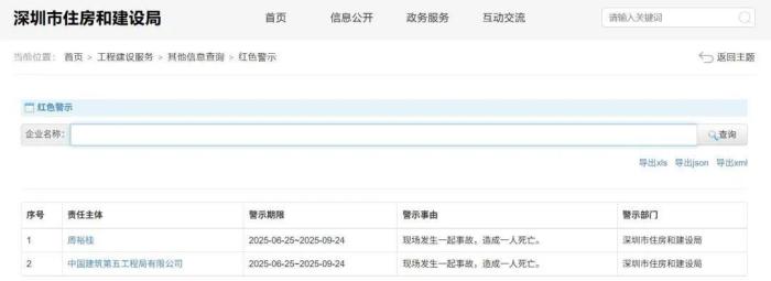 近日,深圳市住房和建设局披露,中国建筑第五工程局有限公司因现场发生一起事故,造成一人死亡,被给予红色警示。同时,该公司人员周裕桂也因同一事故被纳入红色警示范围,两项警示期均从2025年6月25日起至9月24日结束。
