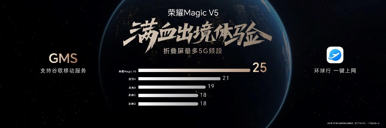 在出境体验方面,荣耀MagicV5支持行业最全的25个5G频段和谷歌全家桶,环球行一键上网;在通信方面,荣耀MagicV5全版本支持北斗卫星通信,天涯海角,时刻在线。